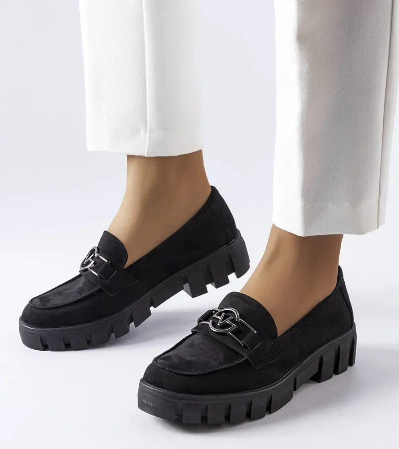 Czarne mokasyny na grubej podeszwie zdobione klamerką Vinceza