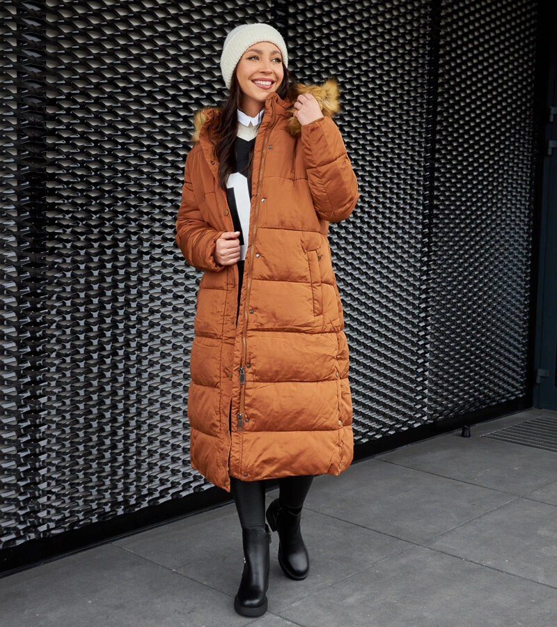 Jasnobrązowa długa pikowana kurtka z kapturem