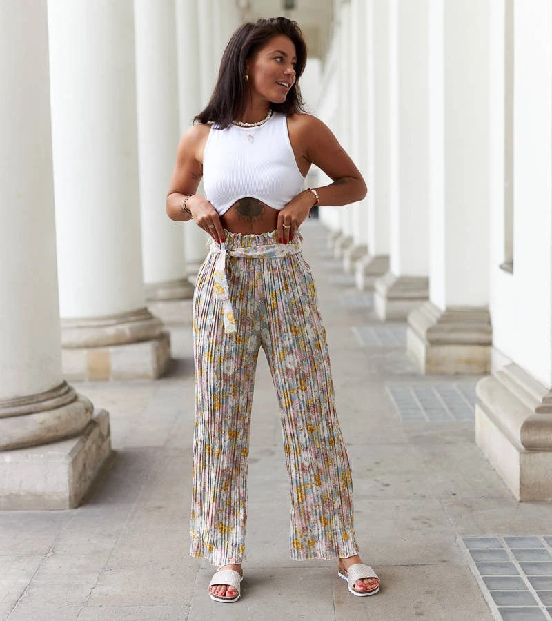 Białe spodnie typu bojówki z naszytymi kieszeniami