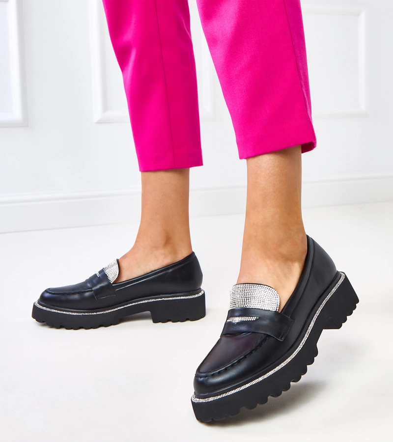 Czarne mokasyny damskie z cyrkoniami