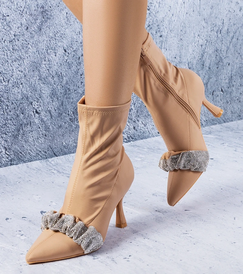 Beżowe botki na szpilce bogato zdobione cyrkoniami