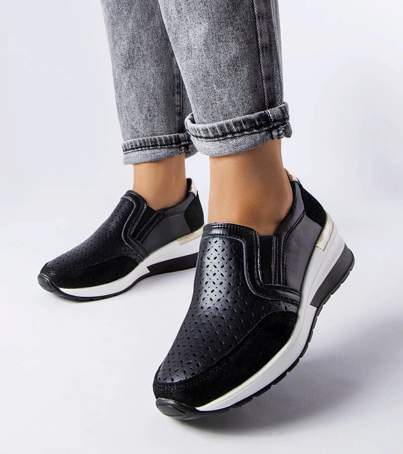 Czarne wsuwane sneakersy na koturnie zdobione perforacją