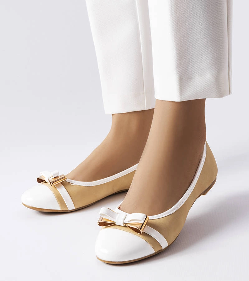 Hers Biało-beżowe balerinki z kokardką i lakierowanym noskiem