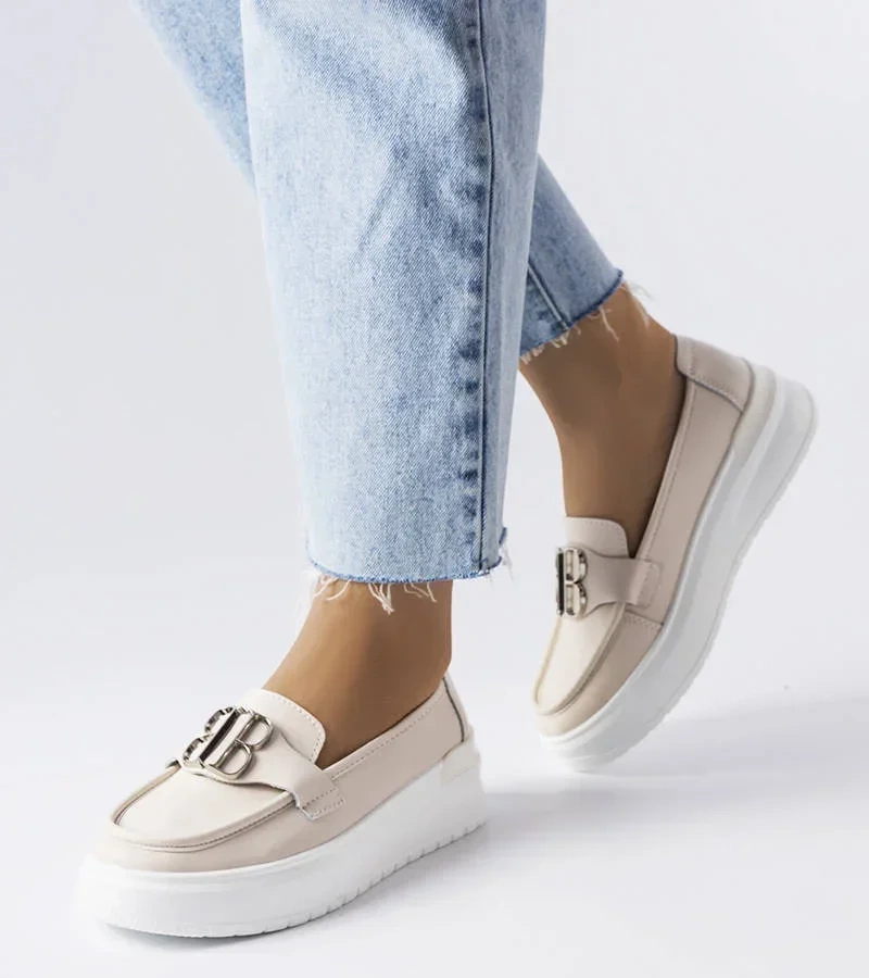 Beżowe mokasyny na grubej podeszwie zdobione klamerką Vinceza