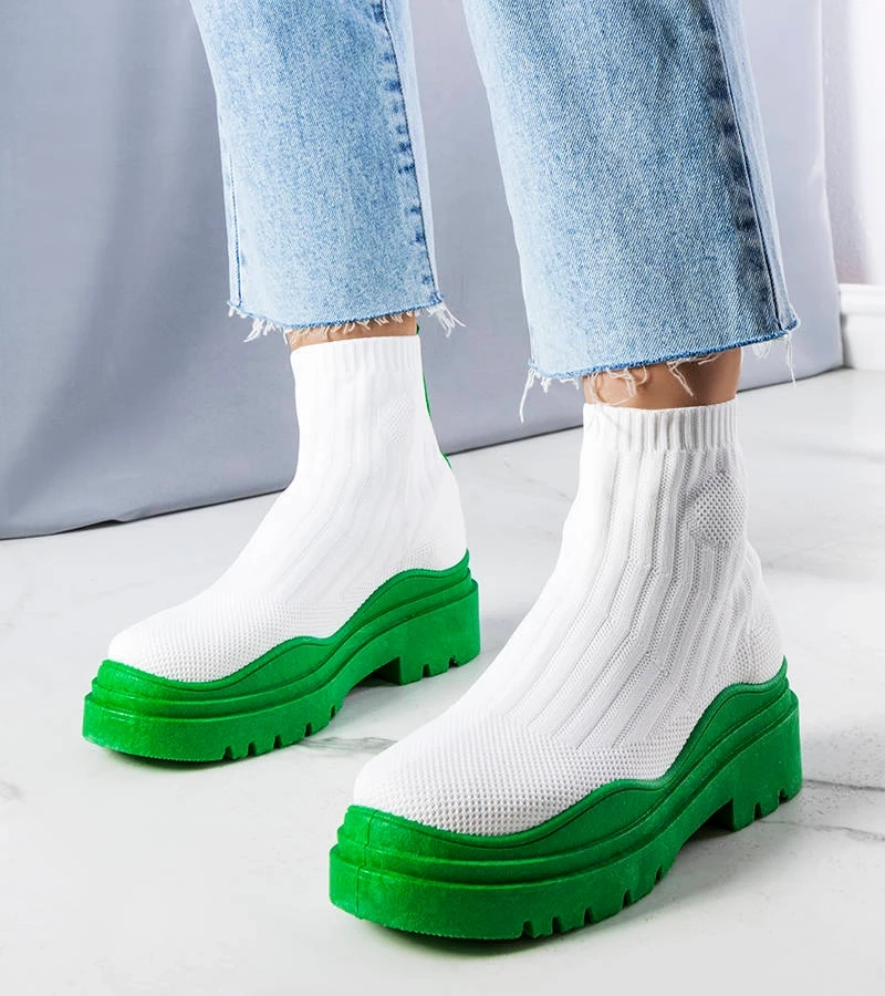 Białe elastyczne botki na zielonej podeszwie