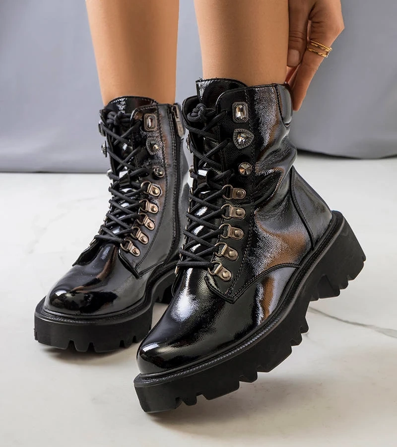 Czarne lakierowane botki typu traperki