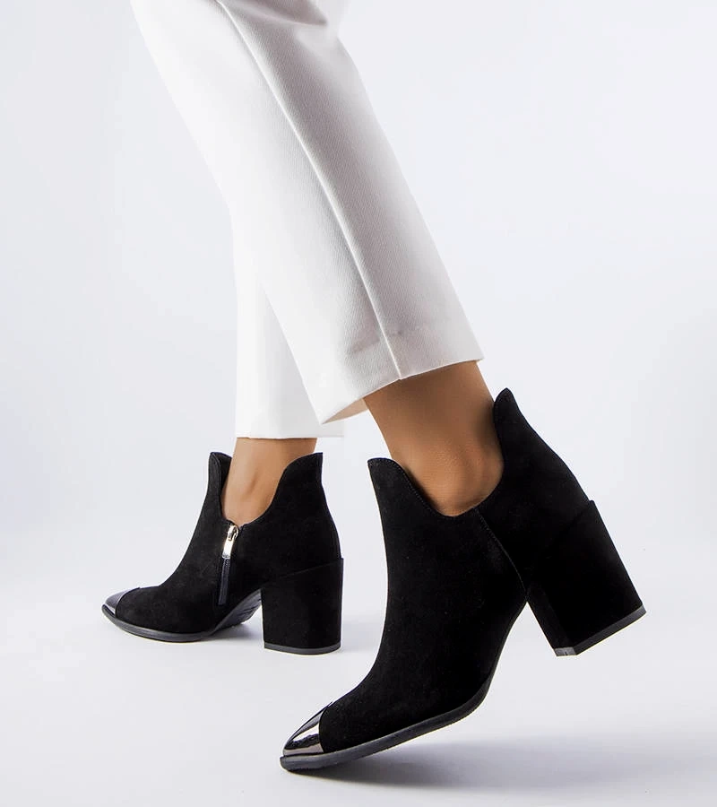 Czarne botki skórzane ze zdobionym szpiczastym noskiem Karino
