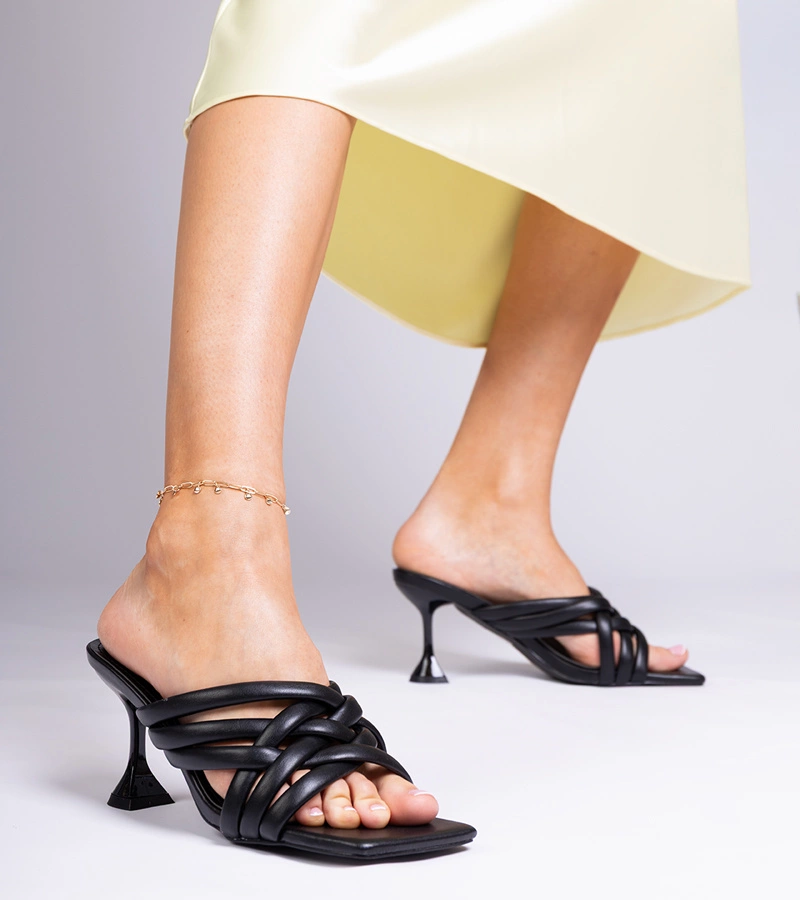 Czarne sandały na obcasie z plecionymi paskami